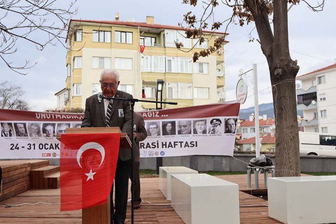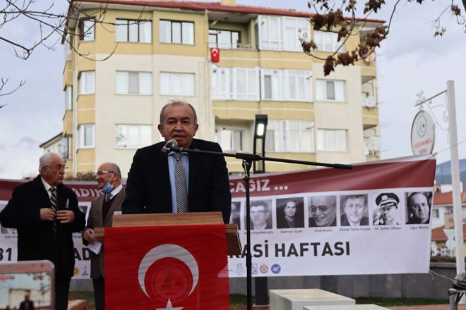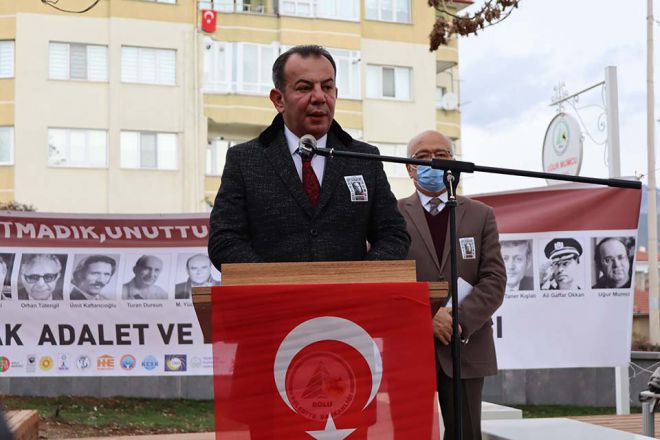 unutturmayacağız. Bu yıl ve şuanda olduğu gibi geçmişte de her yıl 24 Ocak’ta anma töreni yaptığımız bu park, biliyorsunuz Uğur Mumcu Parkı’dır. Bolu Belediyesine geçmiş dönemde bir dilekçe vererek bu parkta Uğur Mumcu anısına bir anıt dikilmesi önerisinde bulunmuştuk. Ne yazık ki o zamanki yönetim bu dilekçemize cevap vermediği gibi bu parktaki kafeteryayı da seçimlerden kısa bir süre önce sözde bir gençlik vakfına kiralamıştı. Ancak Belediye Başkanımız Tanju Özcan göreve gelir gelmez bu kiralamayı iptal ederek kafeteryayı geri almış ve kafeteryaya Uğur Mumcu Gençlik Merkezi adını vermiştir. Atatürkçü Düşünce Derneği Bolu şubesi şimdi adını anacağım sivil toplum kuruluşları Çağdaş Yaşamı Destekleme Derneği, Bolu Kadınlar Birliği, Bolu Halkevi, Eğitim-İş, Türkiye Güçsüzler Vakfı Bolu Şubesi, Makine Mühendisleri Odası Temsilciliği, Bolu Ziraat Mühendisler Odası, Eğitim-Sen olarak geçmişte bu yönde yaptığımız talebimizi yerine getiren parkı yeniden düzenleyerek bakımsızlıktan kurtaran Tanju Özcan’a ve ekibine çok teşekkür ediyoruz. Özgür, çağdaş ve laik Türkiye’nin sonuncusu olan usta gazeteci Uğur Mumcu ve katledilen diğer aydınlarımızı rahmet, minnet, özlemle anıyoruz” ifadelerini kullandı.