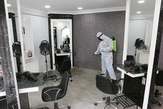 COVID-19 tedbirleri kapsamında bugüne kadar 3 milyon 750 bin metrekare açık alan, 3 milyon metrekare kapalı alan ve 650 kilometre yol dezenfekte ederek salgınla mücadelede önemli bir başarıya imza atan Bolu Belediyesi, 11 Mayıs itibariyle hizmet vermeye başlayacak olan berber, kuaför ve güzellik salonlarını da dezenfekte etmeye başladı. Bu kapsamda Bolu Kuaförler Odası tarafından iletilen talepler doğrultusunda, il genelindeki berber, kuaför ve güzellik salonlarına yönelik dezenfekte çalışmaları tüm hızıyla sürüyor. Bolu Belediyesi’ne bağlı ilaçlama ekipleri ilgili salonlarını tek tek dolaşıp virüse karşı dezenfekte ediyor. Ekipler ayrıca berber ve kuaförlere ücretsiz maske ve eldiven desteği de sağlıyor.