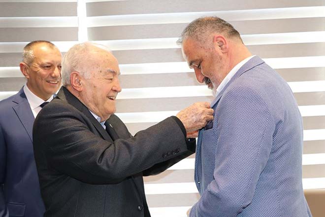 Yeni üyelerin rozetini Ahmet Baysal taktı