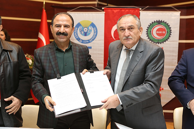 Edinilen bilgiye göre, Bolu Belediyesi ile Hizmet-İş Sendikası arasında toplu iş sözleşmesi imza töreni gerçekleştirildi. Bolu Karaçayır Nikah Salonu’nda Bolu Belediye Başkanı Alaaddin Yılmaz, Belediye Başkan Yardımcıları İhsan Ağcan ve Emine Davarcıoğlu, Hizmet-İş Sendikası Genel Başkan Yardımcısı Celal Yıldız, Hizmet-İş Sendikası Bolu İl Başkanı Hacer Çınar, sendika yetkilileri ve sendika üyelerinin katılımlarıyla gerçekleştirilen törende, toplu iş sözleşmesi imzalandı. Gerçekleştirilen toplu imza töreninde konuşan Yıldız, “Belediye Başkanımız Alaaddin Yılmaz’a emekçi kardeşlerimizin adına, bizlere verdiği destekten dolayı teşekkür ediyorum. Sözleşmemizin ülkemize, Bolumuz’a hayırlı olmasını temenni ediyorum” dedi. Bolu’da Hizmet-İş Sendikası’nın temsilcisi olan Bolu Hizmet-İş Sendikası İl Başkanı Hacer Çınar ise, “Emek veren insanların hakkını takdim etme noktasında attığımız adımda bizleri yalnız bırakmayan ve emekçiyi, emeği gözeten bir görüşe sahip olan başta Belediye Başkanımız Alaaddin Yılmaz olmak üzere herkese teşekkür ediyorum. Allah yolumuzu açık etsin. Sözleşmemizin hayırlara vesile olmasını diliyorum” şeklinde konuştu.