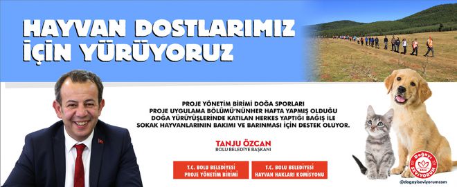 Bolu Belediyesi şehrin doğal ve kültürel güzelliklerini tüm Türkiye’ye tanıtarak Bolu’yu doğa sporlarının merkezi yapma amacıyla her hafta trekking (dağ yürüyüşü) etkinliği düzenleniyor. Proje Yönetim Birimi Doğa Sporları Proje Uygulama Bölümü tarafından her hafta farklı bölgeyi tanıtmaya yönelik düzenlenen etkinliklerde atılan her adım sokak hayvanlarını doğrudan ilgilendiriyor. Etkinlikte uzman personel eşliğinde kentin saklı cennetlerini keşfetmek için yürüyen doğa tutkunları, yaptıkları bağışlarla sokak hayvanlarının bakım ve barınma ihtiyaçlarının giderilmesine katkı sağlıyor. Burada elde edilen gelirin tamamı ise Bolu Belediye Başkanı Tanju Özcan’ın talimatıyla geçtiğimiz aylarda Türkiye’de bir ilke imza atılarak kurulan Bolu Belediyesi Hayvan Hakları Komisyonu’na bağışlanıyor.Komisyon da bağışlanan meblağın tamamını sokak hayvanlarının barınma ve yiyecek ihtiyaçlarının karşılanmasında kullanarak kentteki sokak hayvanlarının en büyük destekçisi oluyor.Anlamlı etkinliğe katılmak isteyen vatandaşlar, Facebook “Doğayı Seviyorum” sayfasından başvuruda bulunabilirler.