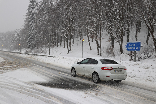 Bolu’da sabah saatlerinde başlayan yoğun kar yağışı Bolu Dağı’nın D-100 Karayolu ve TEM Otoyolu kesimlerinde etkili oluyor. Yağış sebebiyle, sürücüler D-100 karayolunun Yumrukaya, Abant Kavşağı, Elmalık, Bakacak, Seymenler, Karanlıkdere, Bıçkıyanı, Sarıçökek bölgelerinde zor anlar yaşıyor. Karayolları ekipleri, kar yağışı nedeniyle oluşabilecek olumsuzlukları önlemek için kar küreme ve tuzlama çalışmalarını aralıksız olarak sürdürüyor. Sücüler ise polis ekipleri ve ışıklı tabelalar tarafından hız yapmamaları, takip mesafelerini korumaları ve kış lastiksiz yola çıkmamaları konusunda uyarılıyor.