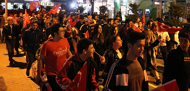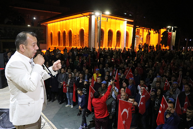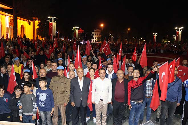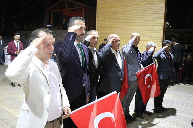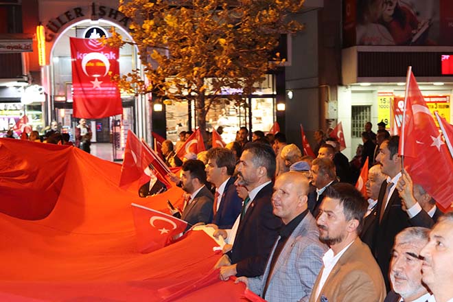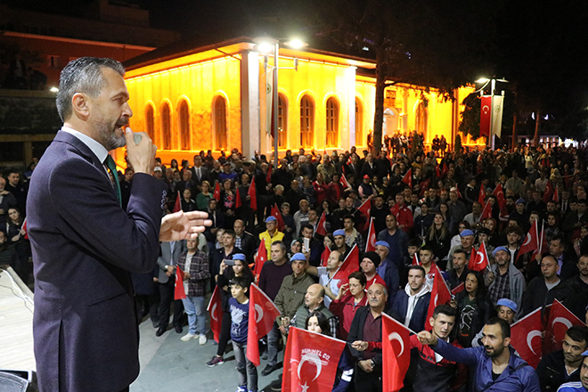 Ak Parti İl Başkanı Nurettin Doğanay binlerce kişiye hitap ederek; “Bazen siyasetin gereği olarak birbirimizi eleştirdiğimiz zamanlar olabiliyor ama Türk milletinin, bu necip milletin 1923’te Gazi Mustafa Kemal Atatürk’ün öncülüğünde ve önderliğinde nasıl yedi düvele karşı dik durduysak, bugün de söz konusu vatansa, sınırımız güvenliği ise PKK, PYD, YPG ve DAEŞ’in hedefi Türkiye’yi parçalamaksa, tüm Avrupa ülkelerinin iş birliği yaparak bize karşı geldilerse Türk milleti doğru yoldadır, doğru istikamettedir. Bizler başta başkomutanımız ile birlikte, askerimizin, polisimizin her daim yanında olacağız. Bugünlerde siyasi çekişmelerden uzak milletimizin birliği ve beraberliği böyle olacağız. Topu üzerimize gelse bizler 1923’teki o ruhla nasıl yedi düvele karşı durduysak bundan sonra da durmaya devam edeceğiz. Ne mutlu Türk’üm diyene!” ifadelerini kullandı.