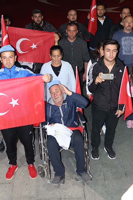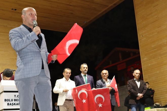 Başkan Özcan, “Bugün önemli bir gün. Bugünler çok önemli günler. Biz bugün burada niye toplandık? Ay yıldızlı bayrağımız ile neden yürüdük? Niye hep bir ağızdan İstiklal Marşımızı söyledik, şehitlerimize saygı duruşunda bulunduk? Niye hep birlikte dua ettik? Dünyaya bir mesaj vermek için. Bizim Türkiye’de zaman zaman siyasal ve dünya görüşlerimiz ayrı olabilir. Bazı meselelere farklı bakabiliriz ama mevzu bahis terörse, mevzu bahis ülkenin istikbali ve geleceği ise işte biz o zaman hep birlikte el ele kol kola yürürüz. Biz bütün dünyaya hep söylüyoruz. Türkiye milletini başkaları ile karıştırmayın. Türk millet mevzu bayrak olunca vatan olunca diğer konuları teferruat sayar hep birlikte yol yürümeye devam eder. Tarih boyunca bu hep böyle olmuştur. İşte biz bu özel günlerde, bir araya gelmeyi başardığımız için binlerce yıldır esir olmuyoruz, esir edilemiyoruz. Bugün burada siyasi partilerimizin temsilcileri ve il başkanlarımız var. Bugün burada değişik dünya görüşünden insanlarımız var. Hepimizi diyoruz ki bugünlerde hep birlikteyiz, yatarken ve kalkarken aynı şeyleri düşünüyoruz. Dua ederken kahraman askerlerimizi başarılı olması için dua ediyoruz. Hepimiz şunu diyerek dua ediyoruz, Allah askerimizin ayağına taş, milletimizin gözüne yaş değdirmesin. Değerli Bolulu hemşerilerim son günlerde takıldığım bir konu var. Terör örgütü ve batı dünyası maalesef ki bir konuya takılıyor. Niye Türk futbolcular gol atınca asker selamı veriyor. Niye jimnastik şampiyonumuz kürsüde asker selamı veriyor, bunu anlamıyorlar. Yolda gelirken söyledik ya her Türk asker doğar diye. İşte bu yüzden. Ben belediye başkanınız olarak terör gruplarına inat, Avrupa’ya inat, UEFA’ya inat tüm Bolu adına askerimiz ve kahraman ordumuza sevgi ve saygılarımızı sunuyorum” şeklinde konuştu.