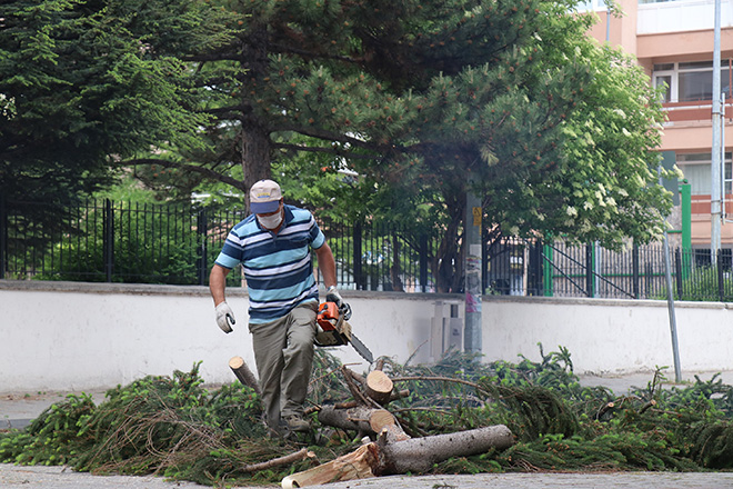 Yola devrilen ağaç parçası, belediye ekipleri tarafından kesilerek yol üzerinden kaldırıldı.