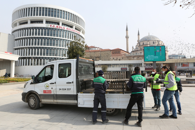 Bolu Belediyesi Covid-19 salgınına karşı önlem üstüne önlem alıyor. Virüsle mücadele için 50 kişilik hijyen timi kuran ve her gün düzenli olarak kamusal alanları dezenfekte eden Bolu Belediyesi, şehir merkezindeki bankları da tedbir amaçlı kaldırdı.