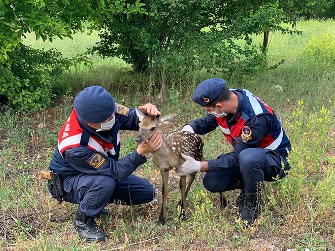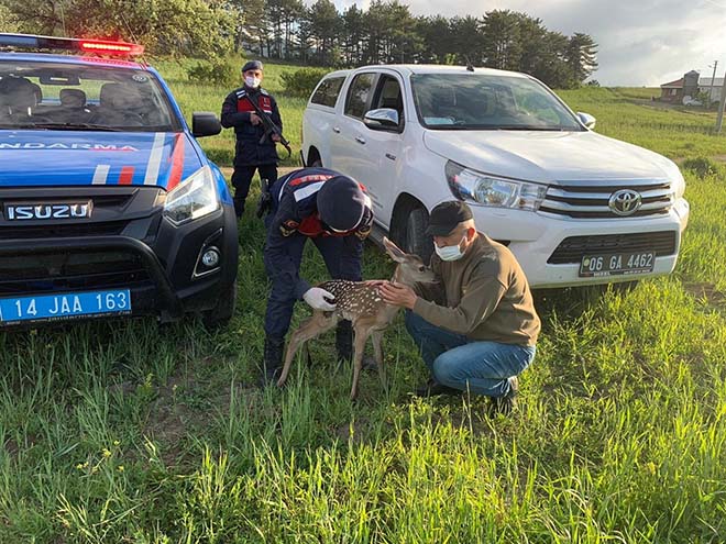 Olay, Bolu’nun Göynük ilçesinde bağlı Yukarıkınık köyünde meydana geldi. Edinilen bilgiye göre, köylüler ormanlık alanda bitkin düşmüş bir yavru geyik buldu. Geyiğin hareket edemeyecek durumda olduğunu fark eden köylüler, durumu jandarma ekiplerine bildirdi. Köylülerin söylediği noktaya gelen İlçe Jandarma Komutanlığı ekipleri, yavru geyiğin üzerini montla örtüp, biberona koydukları sütle beslediler. Geyiğin hareket edecek duruma gelmesi üzerine jandarma ekipleri, araçla taşıdıkları yavruyu Doğa Koruma ve Milli Parklar Müdürlüğü’ne teslim etti.