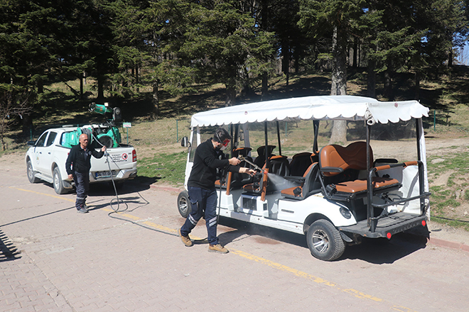 Bolu Belediyesi’ne bağlı ilaçlama ekipleri, parkı ziyaret eden vatandaşların yoğun olarak kullandığı golf arabalarını korona virüs salgınına karşı ilaçladı.