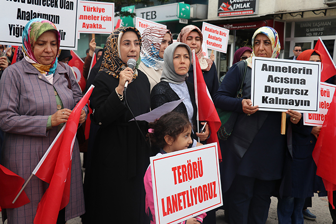 Bolu’da, sivil toplum kuruluşlarının kadın temsilcileri, Diyarbakır’da çocukları terör örgütü tarafından kaçırılan annelerin nöbetine destek olmak için bir araya geldi. Demokrasi Meydanı’nda ellerinde pankartlar ve Türk bayraklarıyla toplanan kadınlar, Diyarbakır’daki annelerin mücadelesine destek olmaya devam edeceklerini söylediler. Grup adına basın açıklaması yapan Hacer Aşık, annelerin direnişinin teröre en büyük darbeyi vuracak iradeyi ortaya koyduğuna inandıklarını belirterek, “Tarih Diyarbakır’daki anneleri ve teröre meydan okuyan direnişlerini saygıyla yazacaktır. Bulundukları şehirlerde siyasi ve toplumsal yalnızlaştırılmayı göze alarak evlatlarının geriye dönmesini isteyen anneler başka canlar çıkmasın diye çıktıkları bu yolda inşallah zafere ulaşacaklardır. Günlerdir yaşanan evlat nöbetlerinde tarifi imkansız acılara şahit oluyoruz. Evladımın ölüsüne bile razıyım diyen annelerin masum ve insani direnişinin yanında olmak hepimizin boynunun borcudur” dedi.