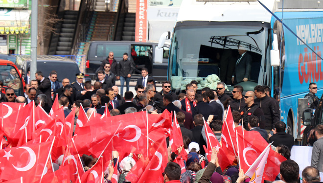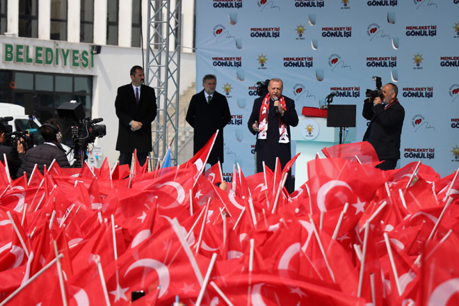 Erdoğan,Türkiye’nin bekasını ilgilendiren her türlü sorunu çözeceklerini ifade ederek, “Ekonomiden, teröre, dış güvenliğe kadar Türkiye'nin bekasını ilgilenen her türlü sıkıntıyı çözüme kavuşturacağız. Her kesimin derdiyle dertlenmeye, sıkıntılarına çare olmaya devam edeceğiz. Daha fazla ter dökerek inşallah sizlerle beraber ülkemizi 2023 hedefleriyle buluşturacağız. 16 bin 500 kilometre öteden silahlarına kazıdıkları yazılarla bizi tehdit edenlere bu ülkeyi bırakmayacağız. Ülkemizin bir terör koridoruyla kuşatılmasına asla müsaade etmeyeceğiz. Milletimizin tökezlemesini bekleyenlere fırsat vermemek için hep birlikte sağlam durmak mecburiyetindeyiz. Bunun için 31 Mart'ta sizlerden rekor oy bekliyoruz. Türk milletine had bildirmeye yeltenenlere sizlerin oylarıyla hadlerini bildirmeyi istiyoruz. 31 Mart'ta verdiğiniz oylar ile milletimize kurulan tuzakları darmadağın etmenizi istiyoruz" diye konuştu.