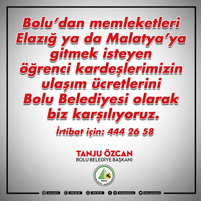 Elazığ’da dün saat 20.55’ te 6.8 büyüklüğünde yaşanan deprem sonrası Bolu Belediye Başkanı Tanju Özcan’ın talimatıyla Bolu’dan memleketleri olan Elazığ ya da Malatya’ya gitmek isteyen öğrencilerin ulaşım ücretleri Bolu Belediyesi tarafından karşılanacak.