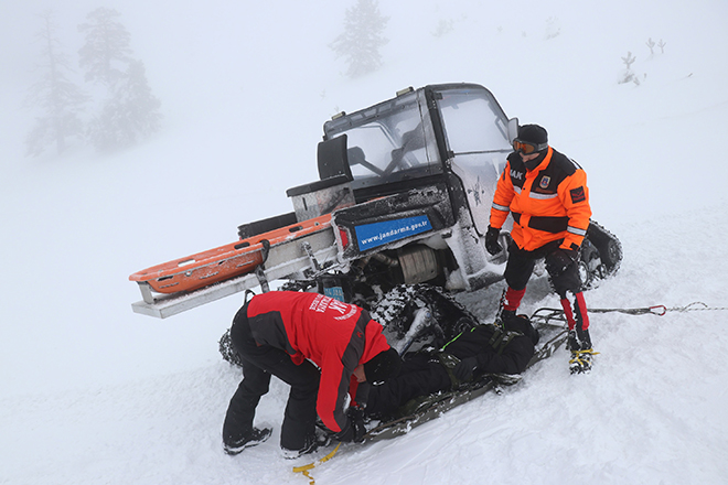 Edinilen bilgiye göre, Bolu'da Köroğlu Dağları'nın zirvesindeki 2 bin 200 rakımlı Kartalkaya Kayak Merkezi'nde bulunan Jandarma Komutanlığı'nda görevli özel eğitimli Jandarma Arama Kurtarma ve Jandarma Özel Asayiş Komutanlığı Timi, hava sıcaklığının sıfırın altında 15 dereceye kadar düştüğü bölgede arama kurtarma tatbikatı düzenledi. Ekipler tatbikat senaryosu gereği ilk olarak kayak pistinin en dik bölgesi olan Kara Pist'te düşerek yaralanan tatilciyi kurtarmak için harekete geçti. İhbarın alınmasının ardından harekete geçen ekipler, kar motorları ve kurtarma için gerekli olan özel donanımlarıyla yaralı tatilcinin olduğu bölgeye gitti. Kurtarma çalışması için gerekli olan düzeneğin kurulmasıyla birlikte ekipler, dik yamaçta yaralı tatilcinin olduğu yere indi. Kar ve tipi altında gerçekleştirilen tatbikatta sedyeye konulan yaralı halatlar yardımıyla dik olan pistten aşağı indirilerek arazi aracına konuldu.