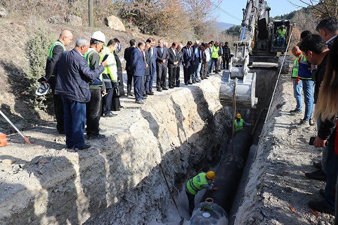 AK Parti Bolu İl Başkanı Nurettin Doğanay’ın da katıldığı incelemede açıklamalarda bulunan Metin, içme suyu tesisatı hattının yapımına devam edildiğini ancak projenin devam edebilmesi için Bolu Belediyesi’ninde yapması gereken şeyler olduğunu belirterek, “Şu an 3.6 kilometrelik tünelin beton kaplama işinin belediye tarafından yapılmasını bekliyoruz. 2019 yılının ikinci yarısı itibariyle 5 buçuk milyonluk ödeneği tahsis ettik. Müteahhitimiz hızlıca çalışmasına başladı. Bu kapsamda 3 kilometrelik tesisatımızı yapımı devam ediyor. Burada 12.6 kilometrelik hattın 3.6 kilometresi tünel. Buradaki betonlama işlemi belediye tarafından yapılacak. Yine 12.6 kilometrelik hat üzerinde 1.9 kilometrelik hatta kamulaştırma işlemi yapılması lazım. O da belediye tarafından yapılacak. Dolayısıyla biz de 12.6 kilometrelik hatta içme suyu tesisatı hattımızın işlemini yapmış olacağız. Biz hizmetlerimize hızlı bir şekilde devam ediyoruz. İnşallah bugün Bolu’nun bir hayali olan içme suyunu tesisatının yapım işini de neticeye vardırmak üzere buradayız. Belediyemizin de üzerine düşen 2 görevi yapmasıyla beraber Bolu’muzun içme suyuna kavuşmasını sağlayacağız” dedi.