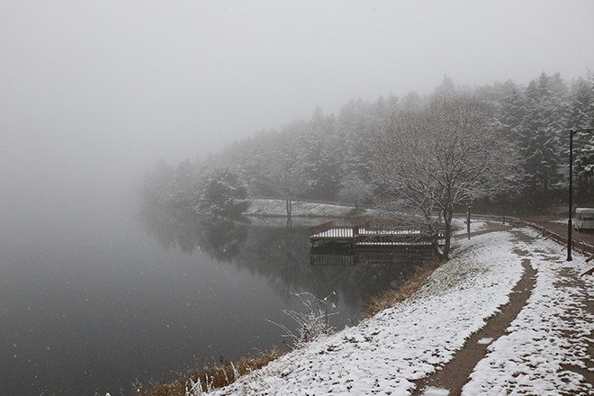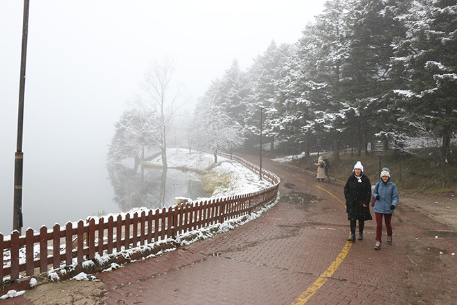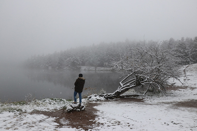 Türkiye’nin en önemli turizm merkezlerinden birisi olan ve dört mevsim ziyaretçilerin akınına uğrayan Gölcük Tabiat Parkı, gece saatlerinde başlayan kar yağışıyla beyaza büründü. Gölcük Tabiat Parkı’nda bulunan göl çevresindeki çam ağaçlarının karlarla kaplanması kartpostallık görüntüler oluşturdu. Mevsimin ilk kar keyfini Gölcük’te yaşamak isteyen tatilciler ve fotoğraf tutkunları, büyüleyen manzara eşliğinde vakit geçirdiler. Kar yağışına aldırış etmeyen tatilciler, göl çevresinde bulunan yürüyüş parkurunda yürüyerek karın tadını çıkardılar. Kar kalınlığının 10 santimetreyi bulduğu Gölcük Tabiat Parkı’nda, göl üzerinde oluşan sis ise, eşsiz bir manzara ortaya çıkardı. Eşi ve köpeğiyle birlikte tatil için ilk kez Gölcük’e gelen Burak Diker, “Gölcük’e 3 günlük tatil için geldim. Gölcük hakikaten çok güzel. Eşim ve köpeğimle keyfini sürüyoruz. Herkese tavsiye ediyorum” dedi.