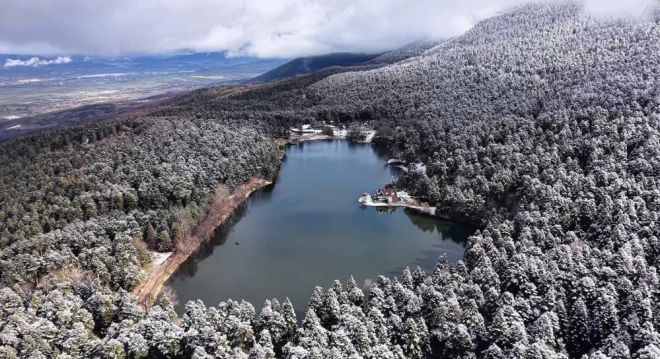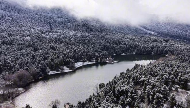 Dron ile havadan kaydedilen görüntülerde, karla örtülü ağaçlar, gölet çevresi ve Devlet Konukevi’nin beyaz örtüyle uyumu dikkat çekti. Her mevsim yerli ve yabancı turistlerin uğrak noktası olan Gölcük Tabiat Parkı, kış aylarında da doğa ve fotoğraf tutkunlarının ilgisini çekmeye devam ediyor.