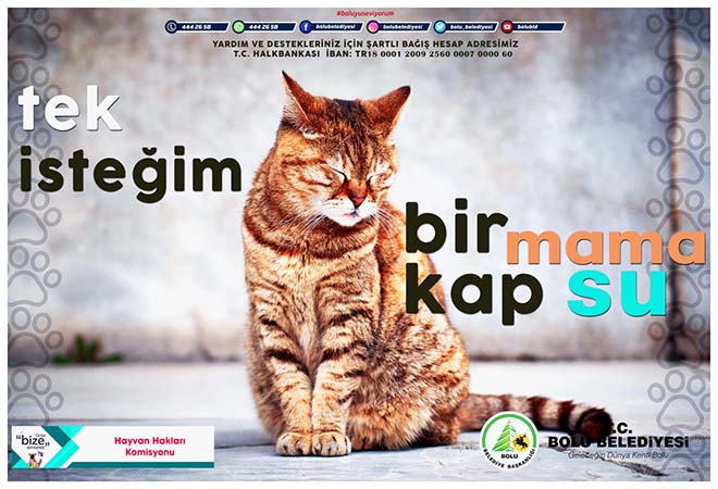 Bu kapsamda vatandaşların dikkatini çekmek ve kampanyaya destek olmalarını sağlamak amacıyla şehrin hemen hemen her nokrasına ‘Tek istediğim bir kap mama, su’ yazan billboardlar asan Hayvan Hakları Komisyonu, aynı zamanda sosyal medya ve basın aracılığıyla da bu duyarlılığı artırmak için sürekli çalışıyor. Hayvan Hakları Komisyonu tarafından başlatılan bu kampanyaya ayrıca destek vermek ve şartlı bağışta bulunmak isteyen tüm vatandaşlar da, Bolu Belediyesi’nin T.C. Halk Bankası IBAN: TR18 0001 2009 2560 0007 0000 60 hesabına bağışta bulunabilecekler. Kampanya kapsamında toplanana bağışlar sadece sokak hayvanlarının bakımları ve ihtiyaçları için kullanılacak.