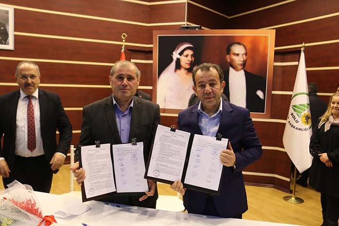 Bolu Belediye Başkanı Tanju Özcan, halk arasında “belediyenin yatarak para kazanma yeri” gibi kötü bir algı olduğunu ve bu algıyı işçilerden değiştirmelerini isteyerek, “Bu anlayışı değiştireceğiz. Vatandaşımız emlak vergisini öderken, helal olsun ben bu parayı ödüyorum, belediye de bu paralarla çalışanlarının maaşlarını ödüyor. Ama belediye çalışanları da adam gibi çalışıyor. Verdiğim para helal olsun demeli.” dedi. Yapılan konuşmaların ardından işveren ve işçi temsilcileri 3 yıl süreli toplu iş sözleşmesini imzaladılar. Kadrolu işçilere yüzde 22,5 zam yapılmasını sağlayan sözleşmenin ardından salondaki belediye çalışanları, yeni sözleşmeyi davul zurna eşliğinde göbek atarak kutladı. Bolu Belediye Başkanı Tanju Özcan da sahnenin önüne inerek işçilerle birlikte davul zurna eşliğinde kutlama yaptı.