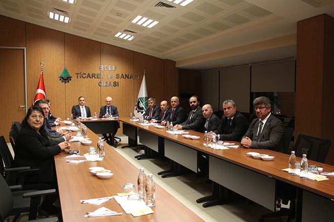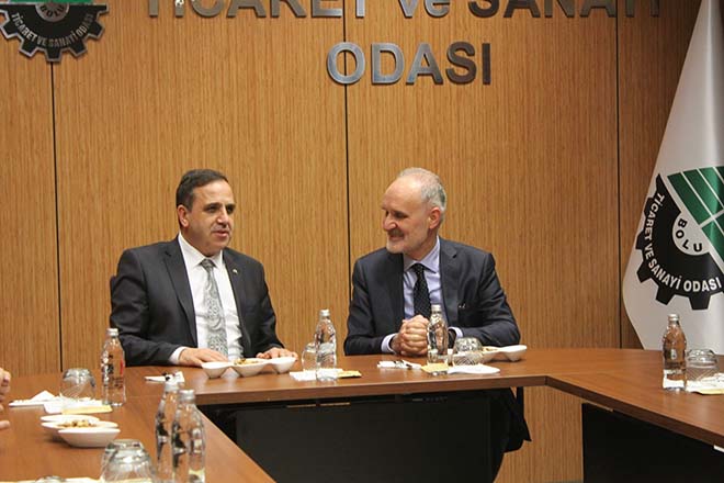 Bolu Ticaret ve Sanayi Odası Başkanı Türker Ateş ise, İTO Heyetini Bolu ve BTSO’da görmekten duyduğu memnuniyeti belirterek başladığı konuşmasında, “Bizim Yönetim Kurulumuzdaki arkadaşlarla takip ediyoruz, Türkiye’nin en büyük Odasısınız. Büyük bir Odayı ağırlamak hakikaten bizim için zor, ama sizin ne kadar mütevazi olduğunuzu, ne kadar çalışkan olduğunuzu çok iyi biliyoruz. Bundan yaklaşık 13-14 sene önce Murat Başkanım da, rahmetli İbrahim Çağlar Başkanımız da bizi ziyaret ettiler. Eski binamızda bizi ziyaret ettiler, şimdi yeni binamızdayız. Sizlere tekrar ilimize, Odamıza gösterdiğiniz ilgiden dolayı teşekkür ediyoruz. Tabi sizin sesiniz çok yüksek. Sizin icraatlarınız, sizin aldığınız kararlar hakikaten herkesi etkiliyor, memleketi etkiliyor. Dolayısıyla yolunuz ağır, işiniz ağır, yükünüz ağır. Bizler de sizlere destek olmak sizlerle beraber çalışmak bizlere keyif veriyor. Bölgemize gelmişsiniz, çalıştayınız var, oradan kopup gelmişsiniz. Bu nezaketinizden dolayı ayrıca çok teşekkür ediyoruz. Yolunuz açık olsun. Hep beraber inşallah bu memlekete saygı olarak destek vereceğiz. Memleketimizi, firmalarımızı kalkındırmak için elimizden gelen gayreti göstereceğiz” ifadelerini kullandı. Konuşmaların ardından düzenlenen toplantıda İTO ve BTSO arasında yapılabilecek ortak çalışmalar ile ekonomi hakkında karşılıklı fikir alışverişinde bulunuldu.