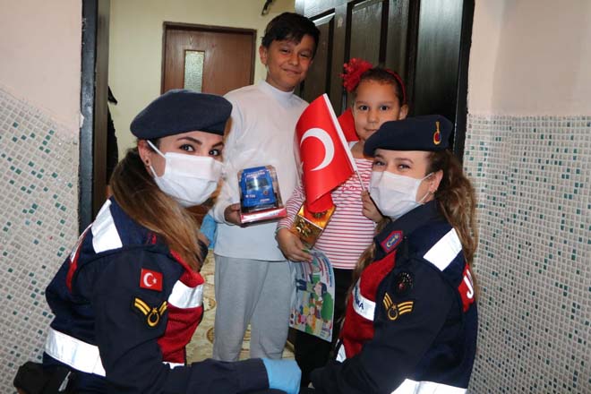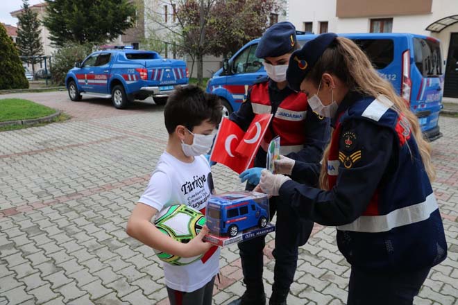Bolu’da korona virüs salgını nedeniyle evlerinden çıkamayan çocukların 23 Nisan Ulusal Egemenlik ve Çocuk Bayramı’nı kutlamak için İl Jandarma Komutanlığı ekipleri çalışma yaptı. Ekipler, görev bölgelerinde yer alan çocuklara hediyeler alarak evlerine gitti. Çocukların bayramını kutlayan jandarma ekipleri, hediyeleri vererek miniklerin bayramını kutladı.