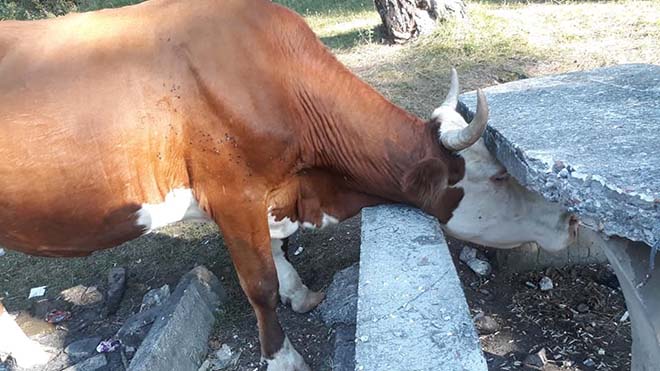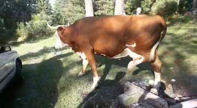 Edinilen bilgiye göre, Mengen’e bağlı Akbuk köyünde bulunan Sıtmapınarı mesire alanında, piknikçilerin bıraktıkları yiyecekleri yemek isteyen Fatih Eroğlu’na ait ineğin kafası beton masa ile oturak arasına sıkıştı. İneğinin kafasını sıkıştığı yerden çıkaramadığını gören Eroğlu, itfaiye ekiplerinden yardım istedi. Olay yerine gelen Mengen Belediyesi itfaiye ekipleri, balyozla beton oturağı kırarak ineğin kafasını sıkıştığı yerden kurtardı.
