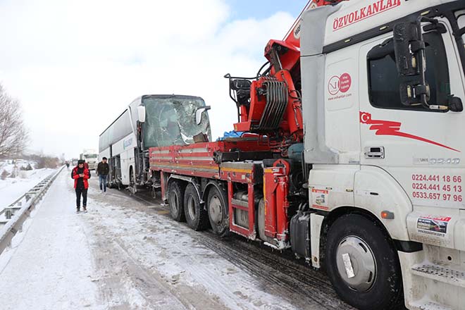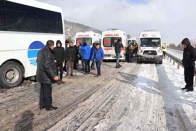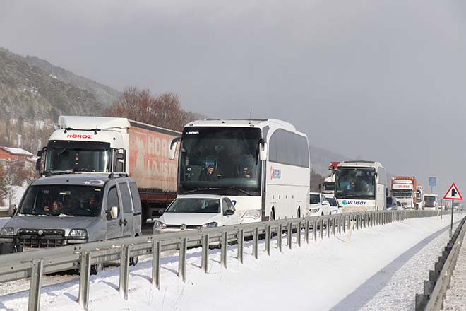 Kar yağışının şiddetini artırması ve buzlanma nedeniyle Gerede-Karabük D-100 Karayolu’nda 2’si yolcu otobüsü 11 araç kaza yaptı. Kazalar nedeniyle trafiğe kapanan yolda yaklaşık 10 kilometrelik araç kuyrukları oluştu. Olay yerine çok sayıda polis ve jandarma trafik ekipleri sevk edildi.Yaklaşık 1 saat boyunca trafiğe kapalı kalan D-100 Karayolu, kaza yapan araçların çekiciler yardımıyla yoldan alınmasıyla tek şeritten sağlanıyor. Trafik ekipleri, yolun tamamen açılması için çalışmalarını sürdürüyor. Ayrıca, kazalarda yaralananlar olay yerine sevk edilen çok sayıda ambulansla ilçe merkezinde bulunan hastanelere götürüldü. Yaralıların sağlık durumlarının iyi olduğu öğrenildi.