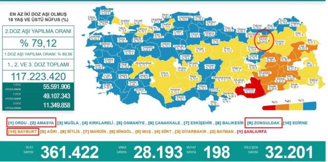 Türkiye’de en çok vaka artışının yaşandığı illeri zaman zaman bünyesinde bulunduran Karadeniz Bölgesi’nde aşılama rakamları dikkat çekiyor. Sağlık Bakanı Dr. Fahrettin Koca’nın son açıkladığı Günlük Kovid-19 Vaka Tablosuna göre Türkiye’de en çok aşı yapılan iller Ordu ve Amasya olurken, bölgedeki en az aşılama yüzdesi ise Bayburt’ta kayıt altına alındı. Bu verilere ters orantı olarak Bayburt, Karadeniz’de en az Kovid-19 vakasına rastlanılan il olarak dikkat çekti. Aşılamada ilk sıralarda yer alan Ordu’da vaka oranı 100 binde 431,31, Amasya’da 332,94 ve Türkiye’de en çok aşılamanın yapıldığı 9. il olan Zonguldak’ta ise vaka oranı 100 binde 518,60 oldu. Öte yandan diğer ilginç bir veri ise bölgede en az aşılama oranına sahip illerden biri olan Karabük (yüzde 74 aşılama oranı), 100 binde 552,92 vaka ile Karadeniz’in en çok vakaya sahip il oldu.