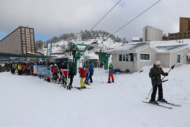 Türkiye’nin en önemli kayak merkezlerinden olan ve Bolu kent merkezine 45 kilometre uzaklıkta bulunan Kartalkaya Kayak Merkezinde kayak sezonu açıldı. Her yıl yerli ve yabancı binlerce tatilcinin tercih ettiği Kartalkaya’da, sezonun açılmasıyla birlikte hafta sonu tatillerini kayak yaparak geçirmek isteyenler yoğunluk oluşturdu. Kar kalınlığının 1 metreyi bulduğu ve 70 kilometre uzunluğundaki 25 pistiyle kayak severlerin en çok tercih ettikleri merkezlerden birisi olan Kartalkaya’ya gelen tatilciler keyifli anlar yaşadılar. Ailesiyle birlikte Beypazarı’ndan hafta sonu tatili için Kartalkaya’ya gelen Adem Çelik, “Kayak sezonu açıldı. Hava güzel. Kar güzel. Kartalkaya güzel. Şu anda 2 pist açık. Her yıl geliyoruz. Kaymak güzel” dedi.