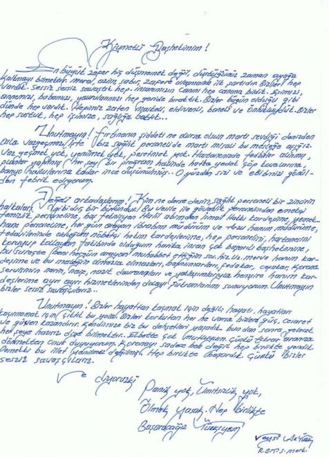 Hastalığı yendikten sonra kendisi ile ilgilenen mesai arkadaşları olan sağlık çalışanlarına mektup bırakan Veysi Aktürk, korona virüsü hep birlikte yendiklerini söyledi. Veysi Aktürk mektubunda şu ifadeleri kullandı: