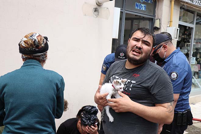 İtfaiye ekiplerinin yanan evde soğutma işlemi yaptığı sırada V.Ö., evde yavru kedilerin olduğunu söyledi. Eve giren ekipler dumanların arasından ‘Bulut’ ve ‘Pamuk’ isimli yavru kedileri kurtararak V.Ö.’ye teslim etti. Kedilerini kucağına alan V.Ö. ik kediye de su içirerek sakinleşmelerini sağladı.