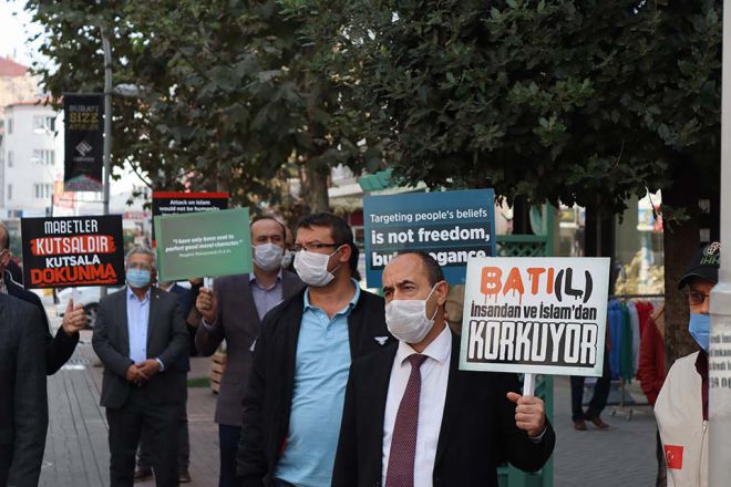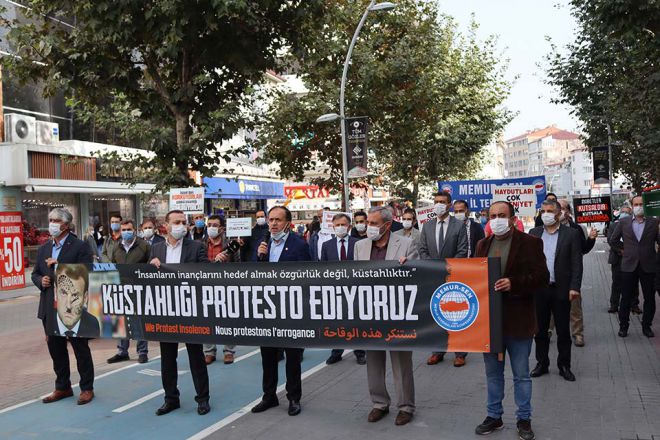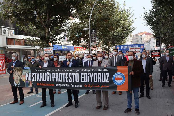 Türkiye’nin 81 ilinde pandemi tedbirlerine uygun olarak gerçekleştirilen eylemlerin Bolu’da ki durağı İzzet Baysal Caddesi oldu. Memur-Sen ve bağlı sendikaların yönetim kurulu üyeleri ile temsili sayıda teşkilat mensubunun katıldığı eylemde basın açıklamasını Memur-Sen Bolu il temsilcisi Ahmet Koçak yaptı. Konuşmasında Fransa Cumhurbaşkanı Macron’un Avrupa’nın genel ruh halini yansıttığını söyleyen Koçak, “Aslında Macron, bir görüntü… Avrupa’da birçok ülkede bir cinnet hali yaşanıyor…Yabancı düşmanlığı, ırkçılık ve İslamofobi, o meşhur Avrupa aklını esir almış, çoğulculuk söylemlerinin sırçası dökülmüş ve nihayet aşırı sağ siyasetin ürettiği politikalar siyaseti belirler hale gelmiştir” ifadelerini kullandı.