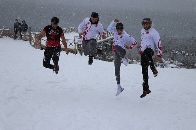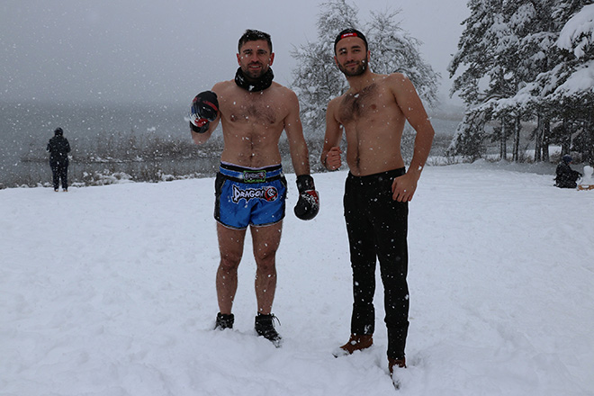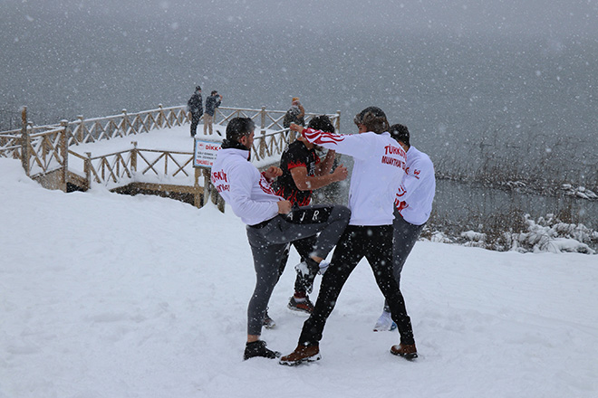 Muay Thai Milli Takımı sporcuları, 1 ay sonra Nevşehir’de gerçekleşecek olan Türkiye şampiyonasına hazırlıkları kapsamında Abant Tabiat Parkı’na geldi. Kar yağışı sonrasında beyaz örtüyle kaplanan Abant Tabiat Parkı’na gelen sporcular, kısa bir süre ısındıktan sonra kıyafetlerini çıkararak eksi 5 derece soğukta antrenman yaptı. Sporcular, dondurucu soğukta dirençlerini artırmak için yaklaşık 1.5 saat boyunca antrenmanlarını sürdürdü.