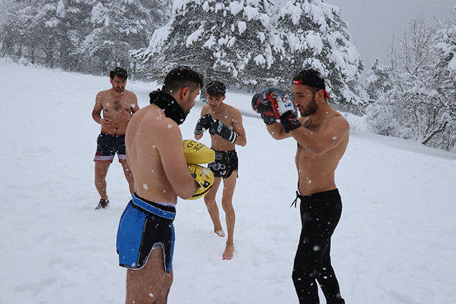 Kar altında çalışmanın zor ama keyifli olduğunu belirten Bişgin, “Sporcular karda durmuyor. Enerjimiz çok güzel. Vücut ısısı artık yükseldiği için soğuğu da hissetmiyoruz. Sporcularımızın stresini attırdık. 1 ay sonra Türkiye şampiyonası var, Nevşehir’de. Muay Thai’de milli takımda kaliteli sporcularımız var. Hem burada birlikteliğimizi artırıyoruz hem de sporcularımız eğlenerek motivasyonlarını yükseltip, kaynaşma etkinliği olarak görüyoruz” şeklinde konuştu.