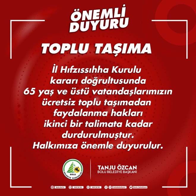 Bolu'da, korona virüs salgını tedbirleri kapsamında , İl Hıfzısıhha Kurulu kararı doğrultusunda 65 yaş ve üstü vatandaşların toplu taşıma araçlarından ücretsiz faydalanma hakları ikinci bir talimata kadar durduruldu.