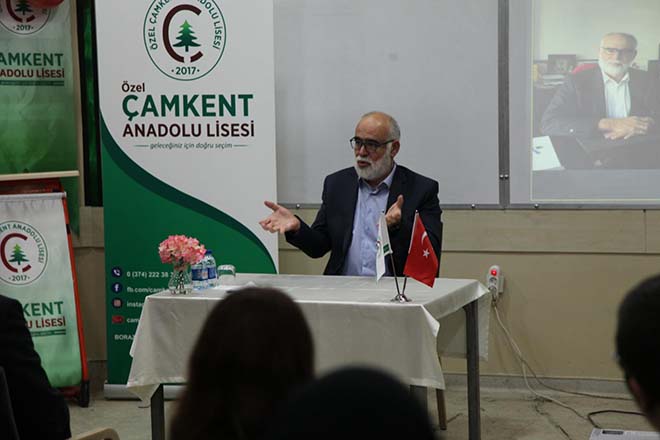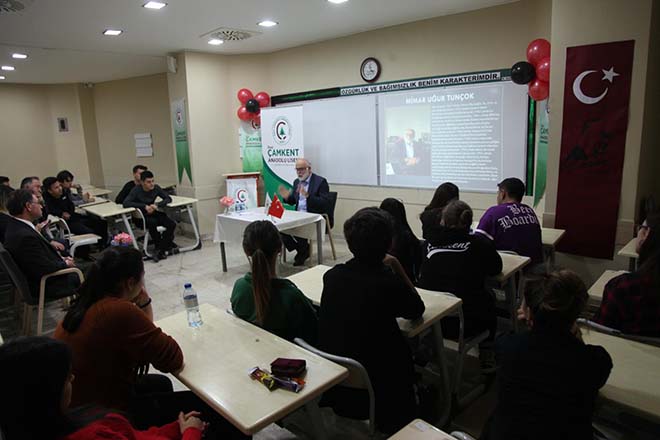 Mimar Uğur TUNÇOK’un yaptığı, öğretmen ve öğrencilerin dikkatle dinlediği söyleşide, başarmanın ve başarılı olmanın formülünü öğrencilere aktarırken kendi hayatından verdiği çok çarpıcı örneklerle ortaya koydu. Öğrencilere mesleki kariyeri hakkında bilgiler veren Mimar Uğur TUNÇOK başarmak için azimli olmanın hedefi tayin etmenin şart olduğunu vurgularken, hangi meslek sahibi olursak olalım mutlaka o meslekte en iyisi olmanın mücadelesinin verilmesi gerektiğini ifade etti. Çok değerli bilgi ve tecrübelerin aktarıldığı bu söyleşi sonunda okul kurucusu Ebru AKIN, Mimar Uğur TUNÇOK’a günün hatırası olarak plaket ve çiçek takdim ederek bu güzel söyleşiden dolayı kendilerine teşekkür etti.