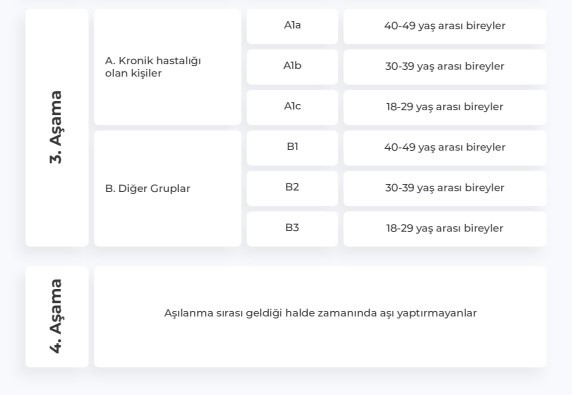 3. aşamada A grubunda, kronik hastalığı olan 50 yaş altı kişilerden başlamak üzere sırasıyla 40-49 yaş arası bireyler, 30-39 yaş arası bireyler, 18-29 yaş arası bireyler yer alıyor. B grubunda ise 50 yaş altı diğer gruplar sırasıyla 40-49 yaş arası bireyler, 30-39 yaş arası bireyler, 18-29 yaş arası bireyler olarak tanımlanıyor.