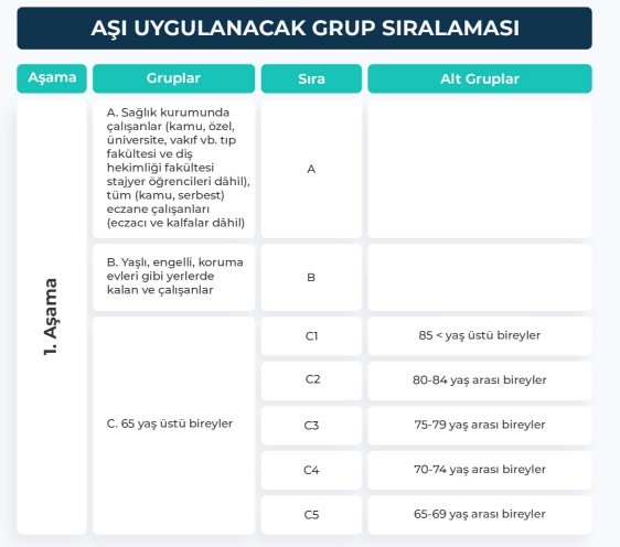 Sağlık Bakanlığının Covid-19 aşısı bilgilendirme platformu sayfası üzerinden yayımladığı şemaya göre aşılama 4 aşamada gerçekleşecek. 1. aşamada aşı olacaklar kendi içerisinde A, B ve C olmak üzere 3'e ayrıldı. A grubunda; sağlık kurumunda çalışanlar (kamu, özel, üniversite, vakıf vb. tıp fakültesi ve diş hekimliği fakültesi stajyer öğrencileri dahil), tüm (kamu, serbest) eczane çalışanları (eczacı ve kalfalar dahil), B grubunda; yaşlı, engelli, koruma evleri gibi yerlerde kalan ve çalışanlar, C grubunda; 65 yaş üstü bireyler yer alıyor. Onlar da kendi içlerinde 85 yaş üstü bireyler öncelikli olmak üzere sırayla 65 yaş üzeri tüm bireyleri kapsayacak şekilde aşılarını olabilecek.