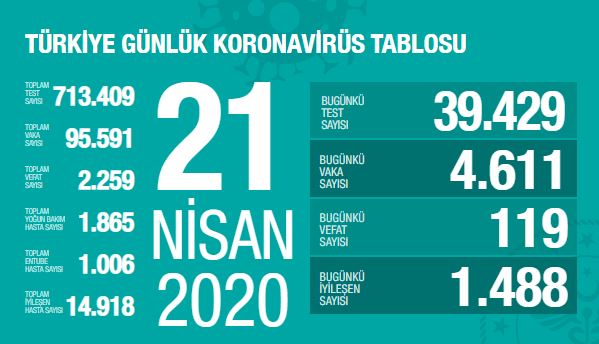 Sağlık Bakanlığından yapılan açıklamaya göre, son 24 saatte 119 kişi korona virüsten hayatını kaybetti, toplam can kaybı ise 2 bin 259 oldu. Bugün toplam 39 bin 429 test yapılırken, 4 bin 611 yeni vaka tanısı konuldu, toplam vaka sayısı ise 95 bin 591 oldu. Bugünkü bin 488 kişiyle ile birlikte toplam iyileşen sayısı da 14 bin 918'e yükseldi. Toplam entübe hasta sayısının bin 6, toplam yoğun bakım hasta sayısının ise bin 865 olduğu açıklandı. Sağlık Bakanı Fahrettin Koca, Twitter'dan yaptığı paylaşımda, “Veriler bize şunu söylüyor: Ümitsiz olma, rehavete kapılma. Unutmayalım ki bu ikisi virüsten daha tehlikeli. Tedbirlere ısrarla uymaya devam edelim. Temas, mesafe, izolasyon” ifadelerine yer verdi.