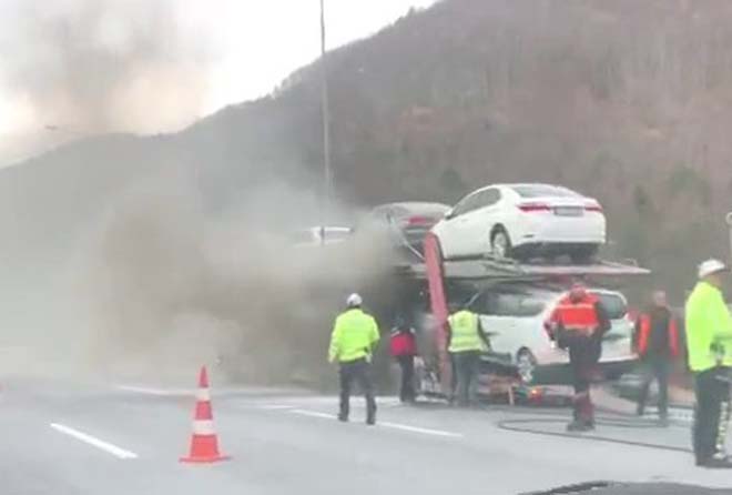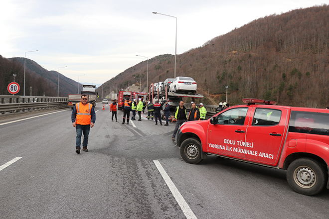 Olay, TEM Otoyolu Bolu Dağı Tüneli mevki'inde meydana geldi. Edinilen bilgiye göre, İstanbul istikametine seyir halinde olan Gökhan Maden idaresindeki 34 JE 6793 plakalı otomobil yüklü tırın lastiklerinde yangın çıktı. Tırdan dumanlar yükseldiğini gören sürücü Maden, aracı emniyet şeridine çekerek polis ve itfaiye ekiplerinden yardım istedi. Olay yerine gelen itfaiye ekiplerinin çalışmasıyla tırda çıkan yangın kısa sürede söndürüldü. Yangında, tırda bulunan sıfır kilometre otomobillerden 2 tanesinde maddi hasar oluştu. Olayla ilgili inceleme başlatıldı.