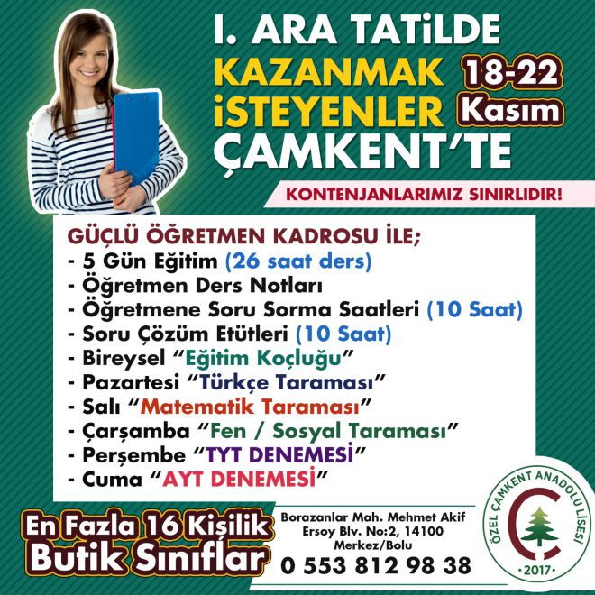 Bolu Özel Çamkent Anadolu Lisesi hem kendi öğrencilerinin hem de Bolu’da ki tüm öğrencilerin katılım sağlayabileceği 5 günlük kamp programında 18-22 Kasım tarihleri aralığında, güçlü öğretmen kadrosu ile 5 gün eğitim (26 saat ders), öğretmen ders notları, öğretmene soru sorma saatleri (10 saat), soru çözüm etütleri (10 saat), bireysel eğitim koçluğu ile Türkçe, Matematik, Fen ve Sosyal Taramalarının yanında TYT ve AYT Denemeleri ile tatilini fırsata çevirmek isteyen öğrencilere kaçırılmayacak bir fırsat sunuyor.
