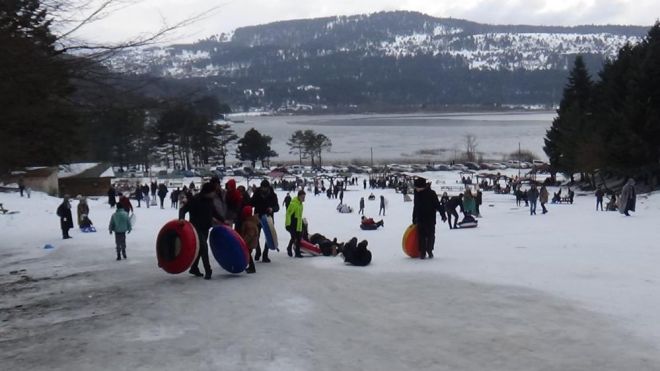Kent merkezine 40 kilometre uzaklıkta bulunan Bolu’nun doğa harikası mekanlarından biri olan Abant Gölü Milli Parkı, hafta sonu tatilinde ziyaretçilerle doldu. Geçtiğimiz hafta boyunca aralıklarla kar yağışının etkili olduğu milli parkta kar kalınlığı yer yer 20 santimetreye ulaştı. Piknik alanının yakınında bulunan rampada tabiat parkına gelen tatilciler tarafından kayak pisti oluşturuldu. Şambrellerini ve kızakları eline alan tatilciler, Abant’ın yolunu tuttu. Eğlenceleri anlar yaşayan tatilciler, şambrellerle ve kızaklarla kayarak tatilin tadını çıkarttı. Düşe kalka kayan vatandaşların güzel görüntüler oluşturdu.