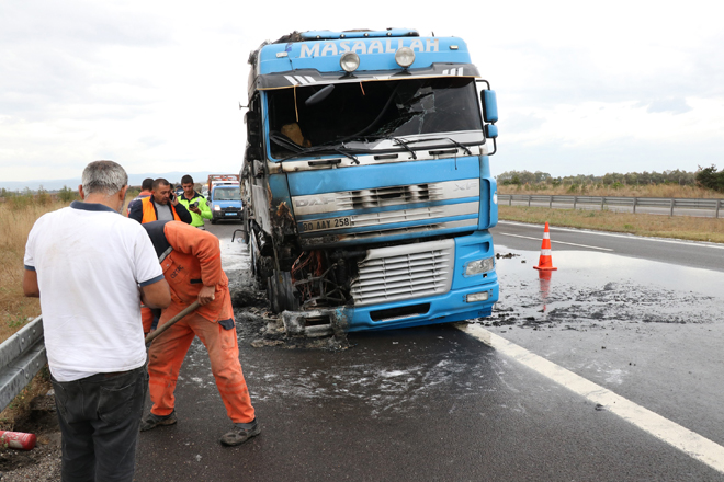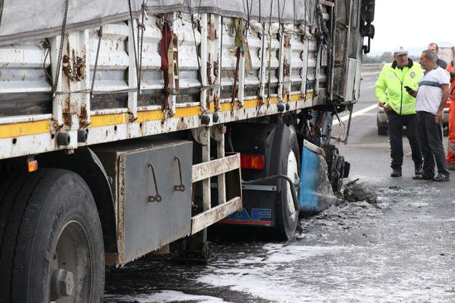 Olay, TEM Otoyolu Gerede Gişeleri mevkiinde meydana geldi. Edinilen bilgiye göre, Ankara istikametine seyir halinde olan Özgür Özcan’ın idaresindeki 80 AAY 258 plakalı sunta yüklü tırın lastiği patladı. Lastiğinin patladığını farkeden sürücü aracını emniyet şeridine çektikten sonra, patlayan lastiğin olduğu bölümden alevler yükseldi. Kendi imkanlarıyla yangını söndürmeye çalışan ancak başarılı olamayan sürücü, itfaiye ekiplerinden yardım istedi. Olay yerine gelen Dörtdivan ve Gerede itfaiye ekipleri, yangına müdahale ederek kısa sürede söndürdü. Yangında hasar gören tır, kullanılamaz hale geldi.