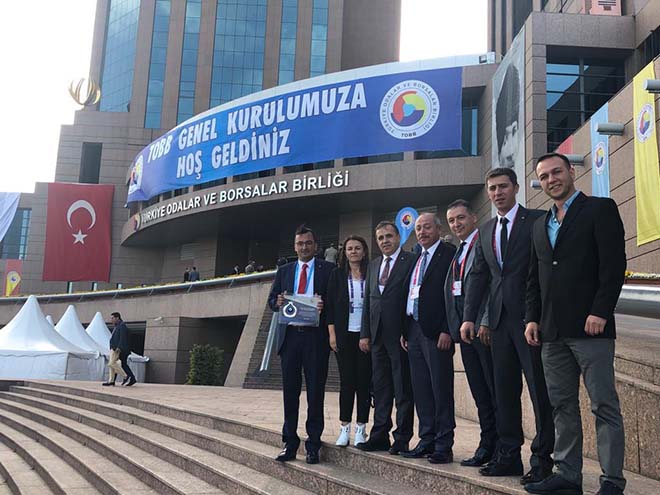 Türkiye Odalar ve Borsalar Birliği (TOBB) Başkanı M.Rifat Hisarcıklıoğlu’nun evsahipliğinde yapılan TOBB 75. Genel Kurulu’nun ilk gününde, TOBB’nin tüm Türkiye’deki 365 oda ve borsa genelinde yaptığı Oda/Borsa Proje yarışmasında başarı gösteren oda ve borsalara ödül takdim edildi. Bolu Ticaret ve Sanayi Odası da Doğu Marmara Kalkınma Ajansı desteğiyle yürütülen ve MARKA’dan o tarihe kadar alınan en yüksek hibe tutarını Bolu’ya kazandıran ilk gümrüklü geçici depolama tesisi projesi ile katıldığı yarışmada, dış ticaret kategorisinde 365 oda ve borsa arasında ilk 5 içinde yer alarak önemli bir başarı elde etti. TSO adına Başkan Türker Ateş’e ödülünü Cumhurbaşkanı Yardımcısı Fuat Oktay, Ticaret Bakanı Ruhsar Pekcan ve TOBB Başkanı Rifat Hisarcıklıoğlu takdim etti. Törene Başkan Türker Ateş’in yanı sıra TSO TOBB genel kurul delegeleri Cavit Demir, Fatih Yamaner, Gürhan Gökdemir ile Kadın Girişimciler Kurulu Başkanı Emine Yüce, Genç Girişimciler Kurulu Başkanı Sertaç Günay ve Genel Sekreter İsmail Gören katıldı.