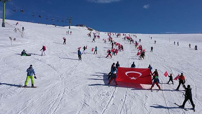 Türkiye’nin en önemli turizm merkezlerinden birisi olan Kartalkaya’da bulunan bir otelin öncülüğünde İdlib şehitlerini anmak için organizasyon düzenlendi. Organizasyon kapsamında kayak pistinde bir araya gelen Türk bayraklı yaklaşık 500 tatilci, ‘Şehitlerimizin ruhu şad olsun’ yazılı pankartın arkasında kayak yaptı. Tatilcilerin büyük destek verdiği şehitleri anma etkinliği, drone ile görüntülendi.