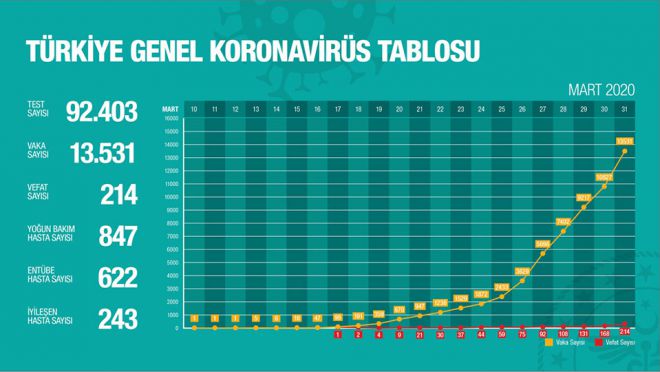 Sağlık Bakanı Fahrettin Koca, bugün virüs nedeniyle 46 kişinin hayatını kaybettiğini açıkladı. Bakan Koca, toplam test sayısının 92 bin 403, toplam vaka sayısının 13 bin 531, vefat sayısının 214, yoğun bakım hasta sayısının 847, entübe hasta sayısının 622, iyileşen hasta sayısının 243, bugünkü test sayısının 15 bin 422, bugünkü vaka sayısının 2 bin 704 ve bugünkü vefat sayısının 46 olduğunu bildirdi.