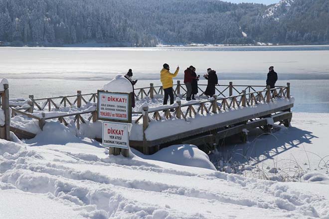 Öte yandan tatilciler, buz tutan gölün üzerine çıkmamaları konusunda yetkililer tarafından uyarılıyor.