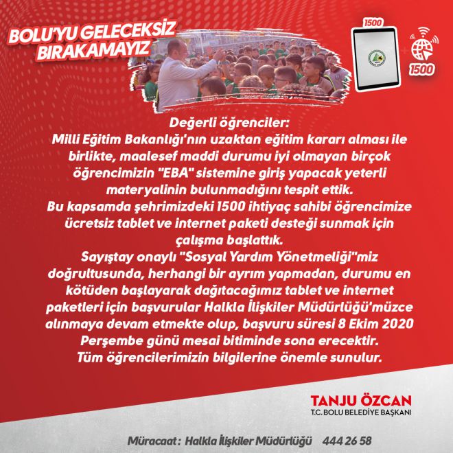 Sayıştay onaylı "Sosyal Yardım Yönetmeliği"miz doğrultusunda, herhangi bir ayrım yapmadan, durumu en kötüden başlayarak dağıtacağımız tablet ve internet paketleri için başvurular Halkla İlişkiler Müdürlüğü'müzce alınmaya devam etmekte olup, başvuru süresi 8 Ekim 2020 Perşembe günü mesai bitiminde sona erecektir.