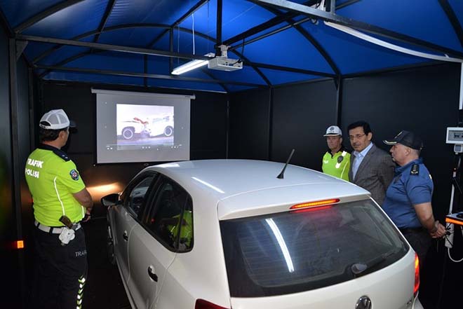 Vali Ümit ve beraberindeki heyet Köroğlu Park Denetleme Noktasında yer alan ve sürücülere kırmızı ışık, emniyet kemeri, direksiyon başında telefonla konuşma vb. konularda bilgilendirme yapılan “Yaşam Tüneli”nde de incelemelerde bulundu. Bir sürücüyle birlikte trafik kazalarını anlatan film izledi.