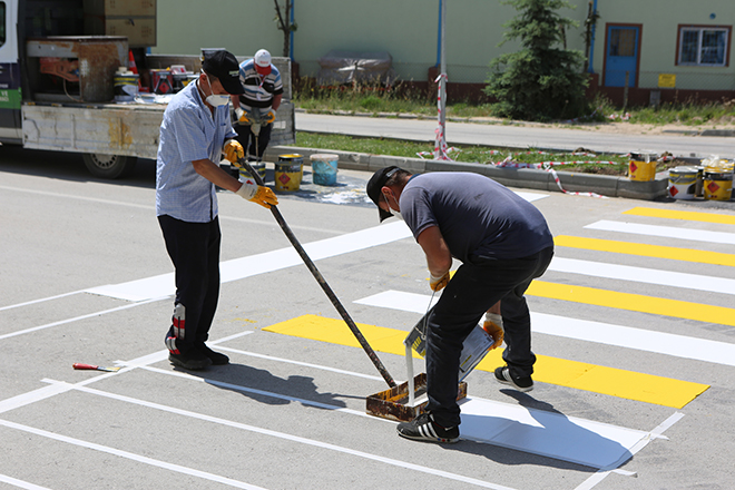 Bolu Belediyesi asfalt çalışmaları tamamlanan bölgelerde yol çizgisi ve yaya geçidi çalışması başlattı. Trafik ve yaya güvenliğine yönelik rutin çalışmalarını sürdüren Destek Hizmetleri Müdürlüğü ekipleri, yeni asfaltlanan yollarda yaya geçitleri ve yol çizgileri çizerken, diğer yandan da mevcut yolların yıpranmış çizgilerini yeniliyor. Bu kapsamda bugün Karaçayır Mahallesi’nde kısa süre önce yapımı tamamlanan yeni dönel kavşak ve çevresinde çalışma yapıldı. Ekipler, güvenlik önlemleri aldıkları dönel kavşak ve çevresinde, yaya geçidi ve yol çizgilerini çizdi.
