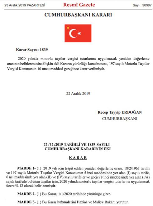 Resmi Gazete’de yayımlanan karara göre, Motorlu Taşıtlar Vergisi artış oranı yüzde 12 olarak açıklandı. Pasaport, ehliyet harcı, trafik cezaları 2020 yılında yüzde 22,58 oranında artacak. Yurt dışından getirilen cep telefonları için ödenen ücret de 2020 yılında 22,58 oranında artacak.